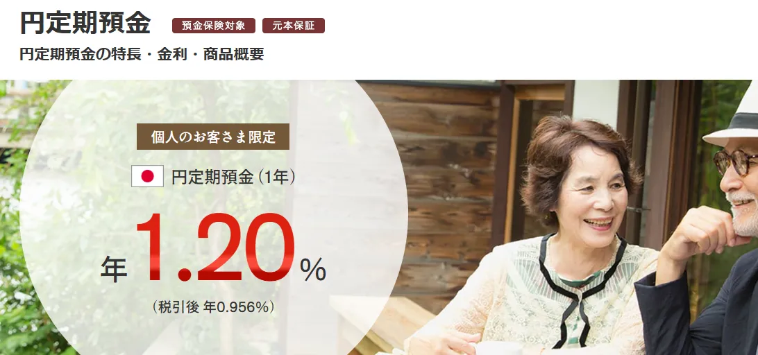 現在提供されている定期預金では、1年物の定期預金で年1.20%(税引前)と、国内銀行の中でもトップクラスの金利水準となっています。