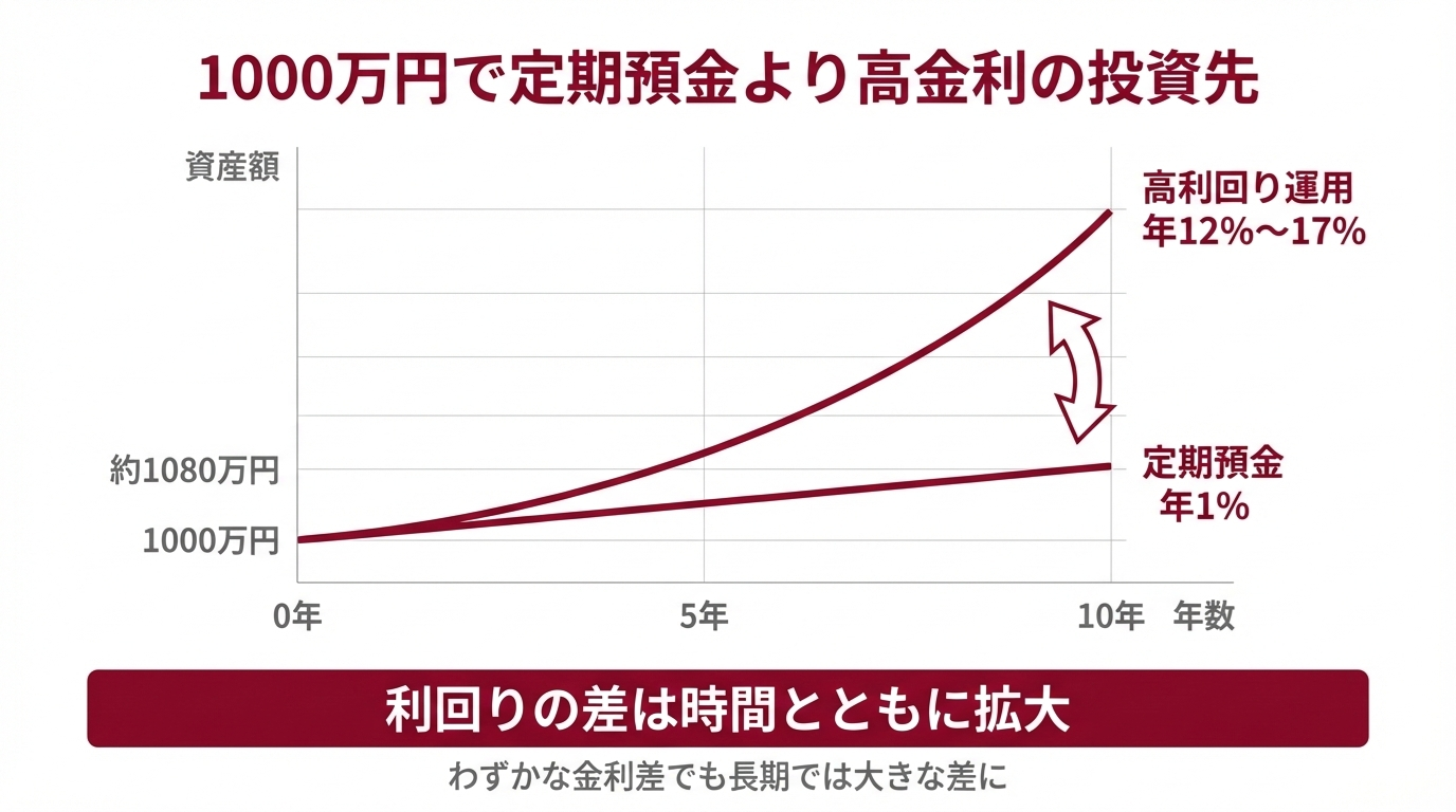 定期預金の金利より高い利回りかつ安全に運用したいなら、ハイクアインターナショナルは1,000万円の投資先として最適な選択肢でしょう。