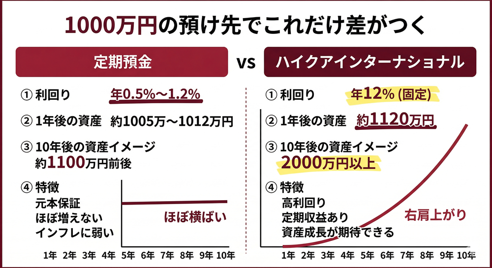 定期預金の金利より高い利回りかつ安全に運用したいなら、ハイクアインターナショナルは1,000万円の投資先として最適な選択肢でしょう。