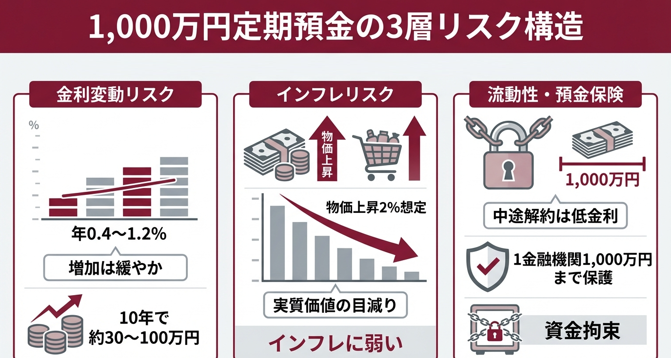 定期預金は高い安全性と引き換えに低い利回りでインフレに弱く、特に1000万円以上のまとまった資産運用で選択を誤ると機会損失が大きいです。