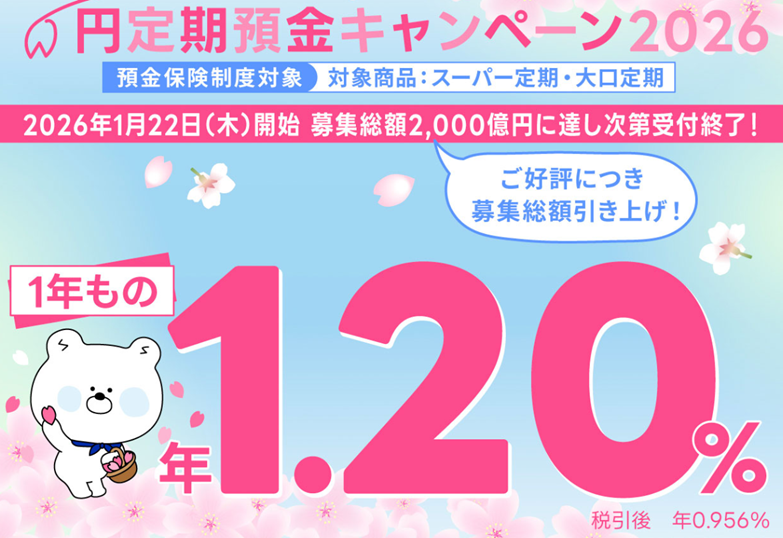 2026年1月22日に募集が開始された「円定期預金キャンペーン2026」では、日本国内に居住する個人であれば誰でも対象となり、1年もの定期預金で年1.20%(税引前)の高金利が適用されます。