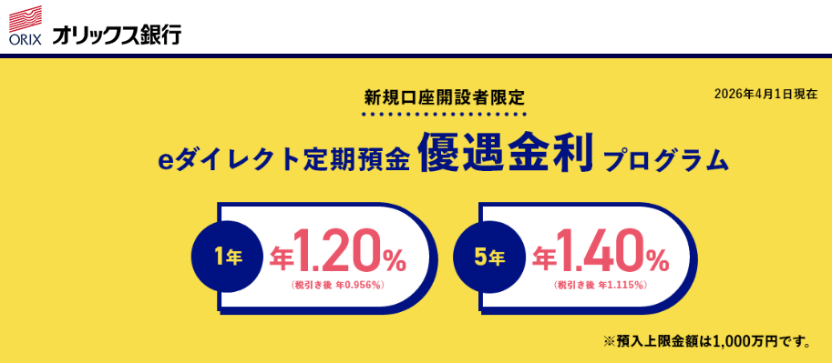 SBJ銀行と同様に、年1.20%で定期預金金利ランキング同率1位となったのが「オリックス銀行」です。