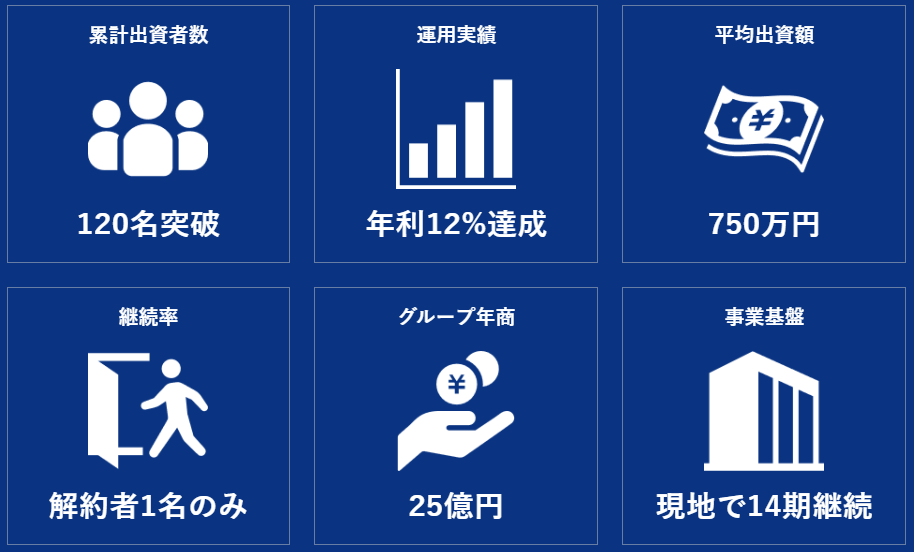 | 特徴 | 出資者累計120名、出資額平均750万円、継続率99%超 | 証券業界30年超のベテラン投資家が代表。透明性・信頼性◎ |