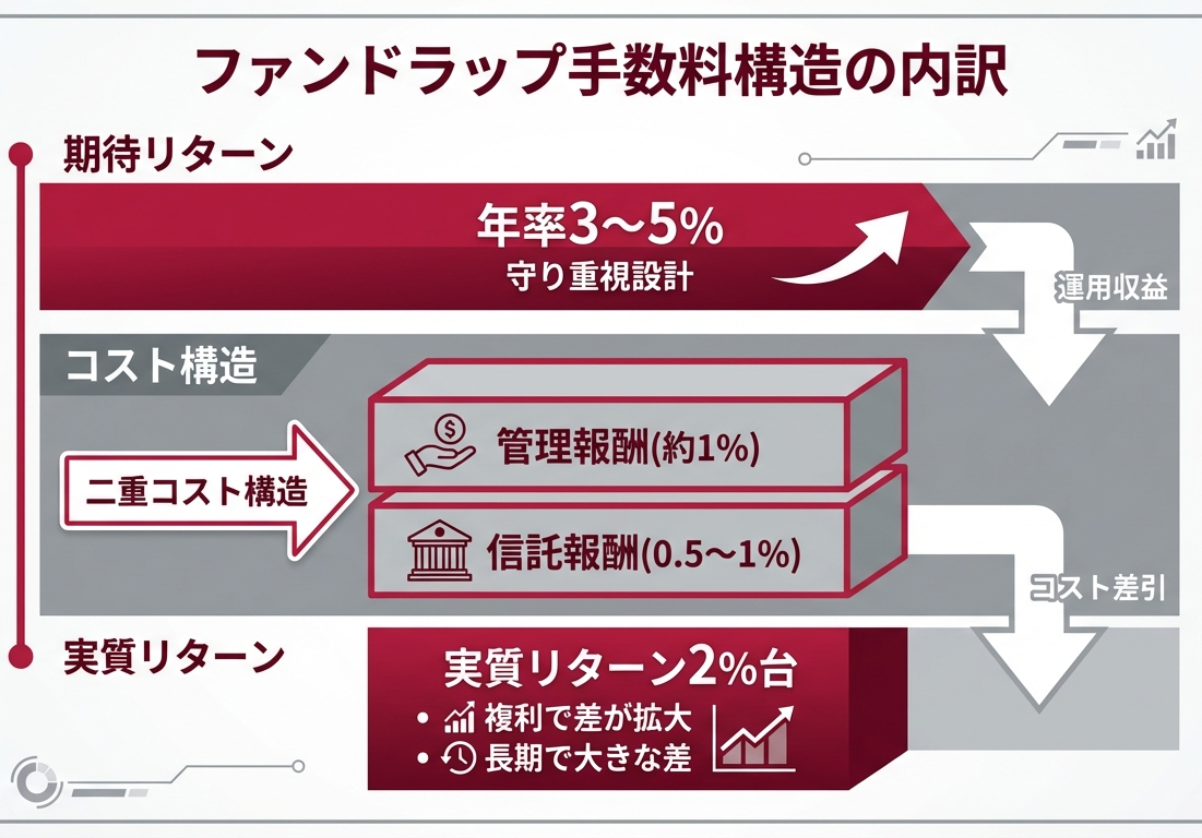 管理報酬に加えて投資信託の信託報酬もかかるため、二重コスト構造がリターンを圧迫。