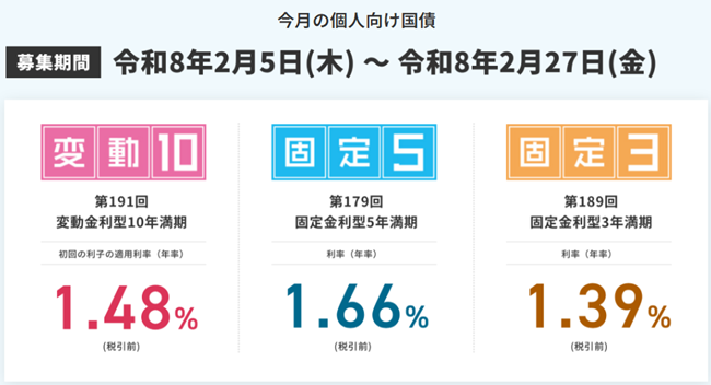 ゆうちょ銀行で取り扱う個人向け国債の金利は、変動10年で「基準金利×0.66」0.05%を下回る場合は0.05%、固定5年は年1.19%、固定3年は年1.02%です。(2025年11月時点)