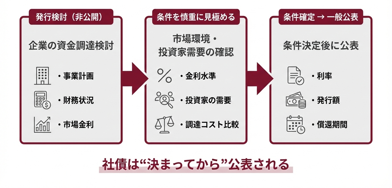 投資家の需要を確認後、企業と証券会社が発行条件(利率・償還期間・発行額など)を決定、条件が整った段階で募集(販売)が開始される流れです。