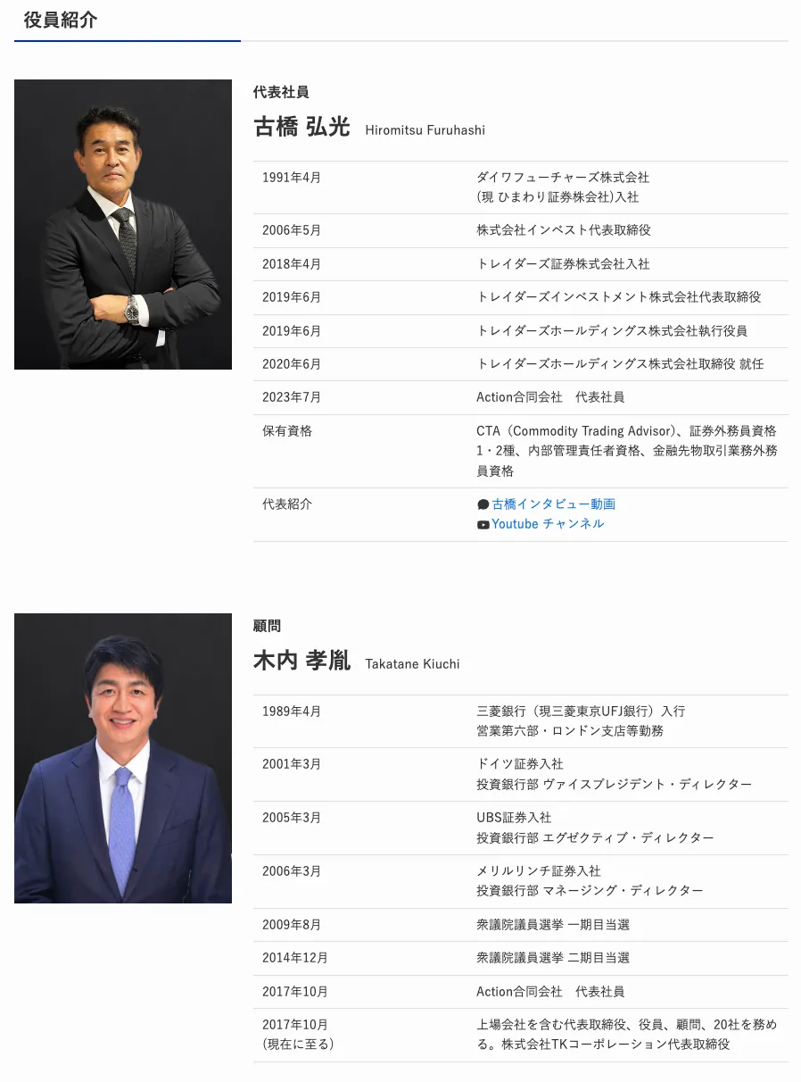 アクションの公式サイトでは、経営陣の来歴・写真がそれぞれ確認できます。