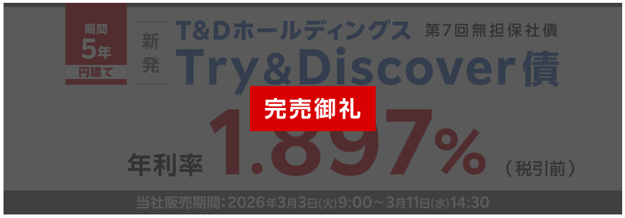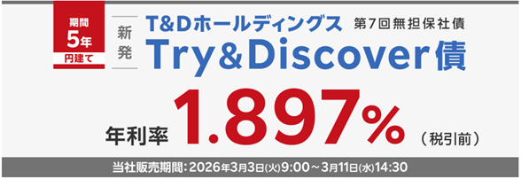株式会社T&Dホールディングス第7回無担保社債は満期5年の固定金利型で、利率は年1.897%、税引後の実質利回りは約1.51%で決定しました。