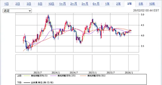 対して、2026年2月時点での米国債券10年物の年利は4.232%でした。